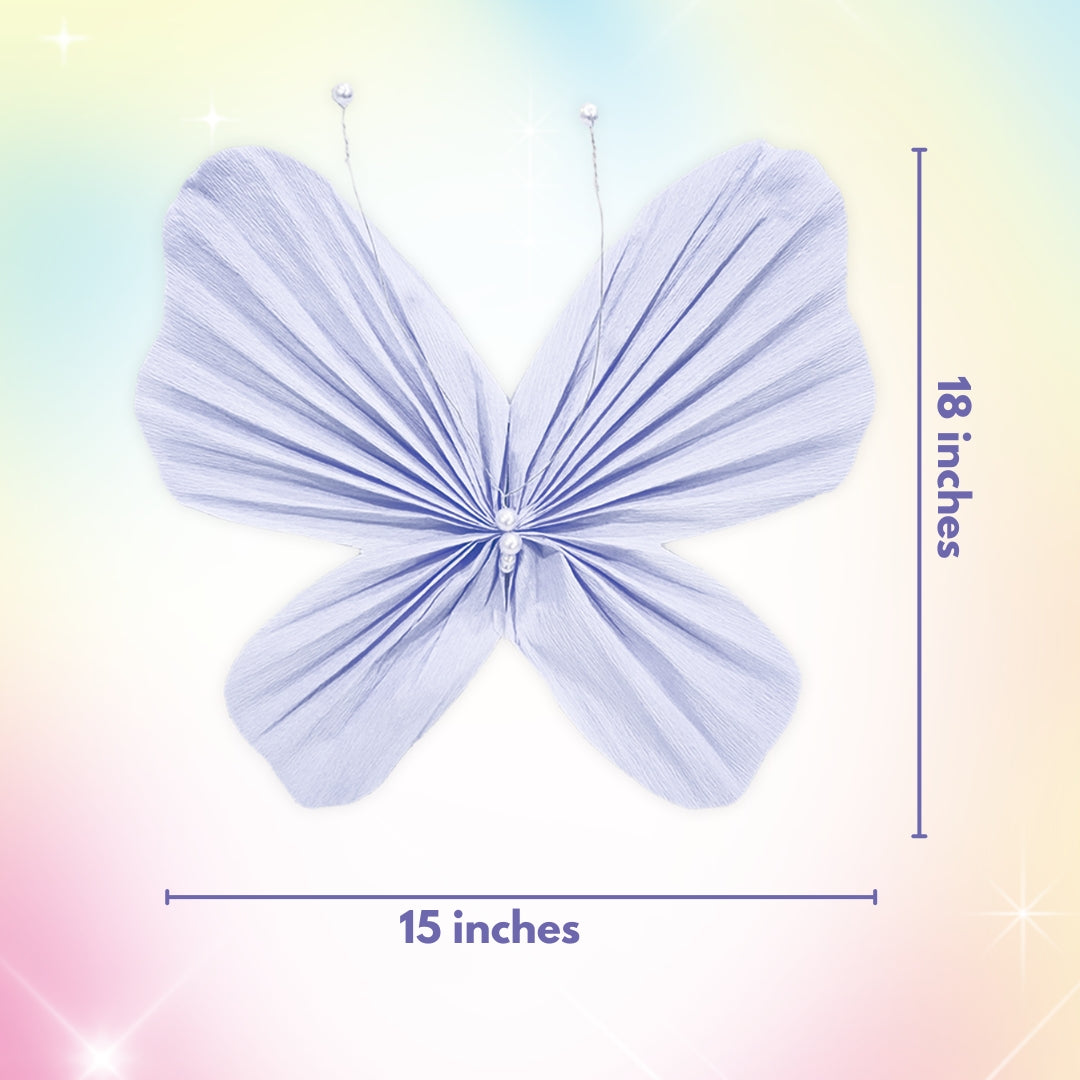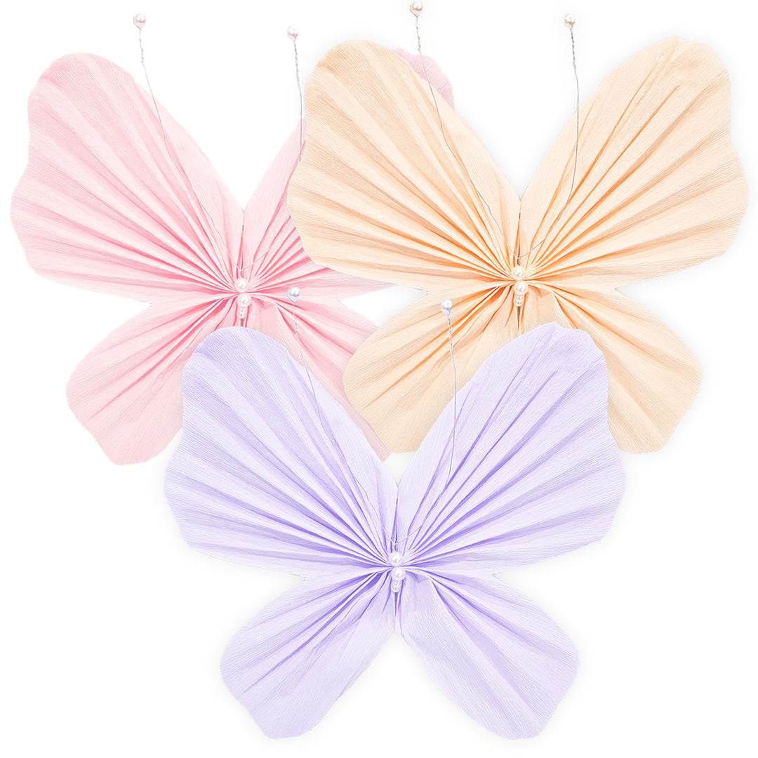 Elegant Butterfly Fan Design: Transform your party or room décor with this exquisite set of 3 butterfly fan decorations in soft peach, pastel purple, and baby pink. Each fan features delicately crafted wings accented with elegant pearl detailing, creating a whimsical and graceful ambiance. The layered design adds dimension and charm, making them perfect for birthdays, baby showers, bridal showers, or any elegant celebration.