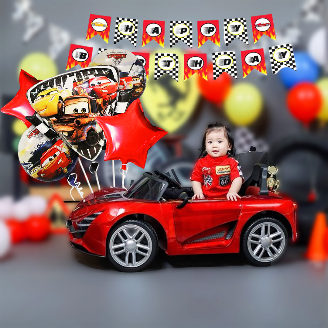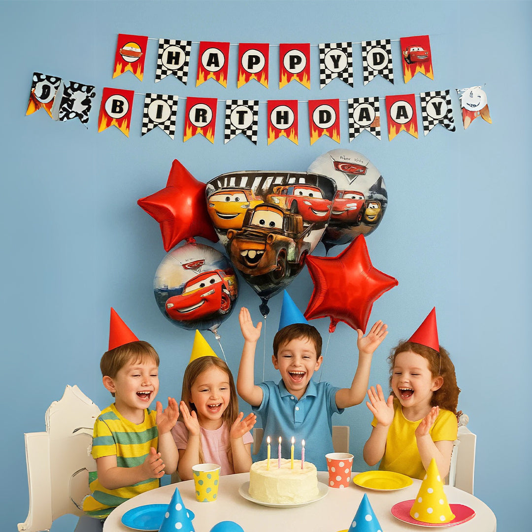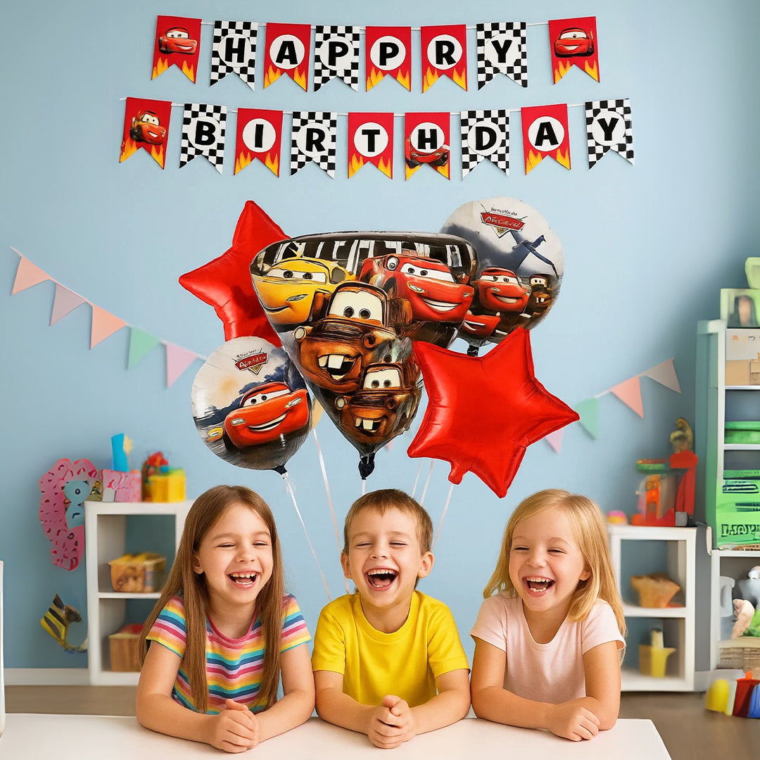 Set of 5 Car: Themed Foil Balloons: Includes 5 premium foil balloons with various car designs, such as race cars, classic cars, or cartoon cars. The shiny finish and vivid colors make them perfect focal points for photo booths or party corners.