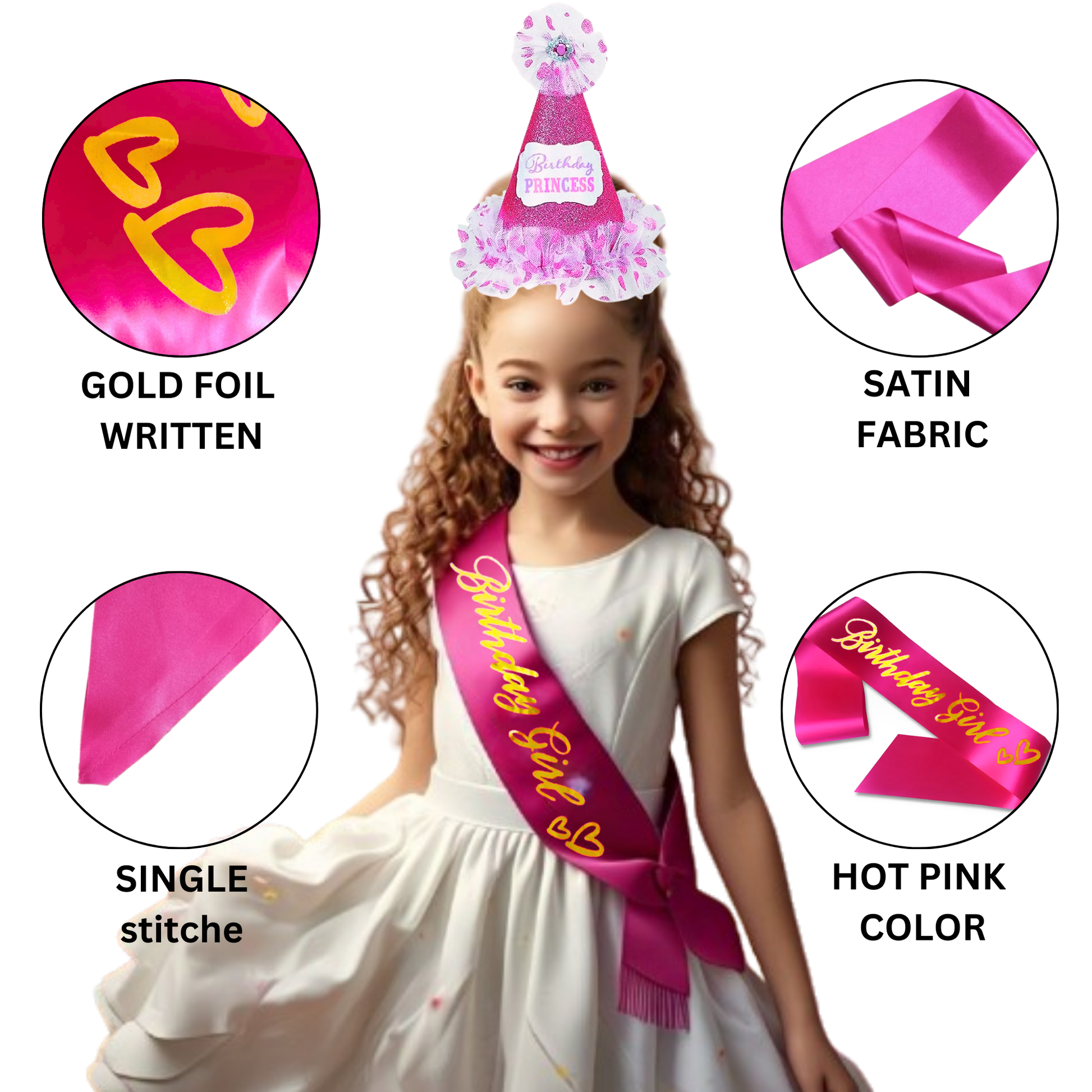 Stylish Birthday Sash: The hot pink sash complements the hat, made of satin or a similar fabric for a smooth, luxe finish.
