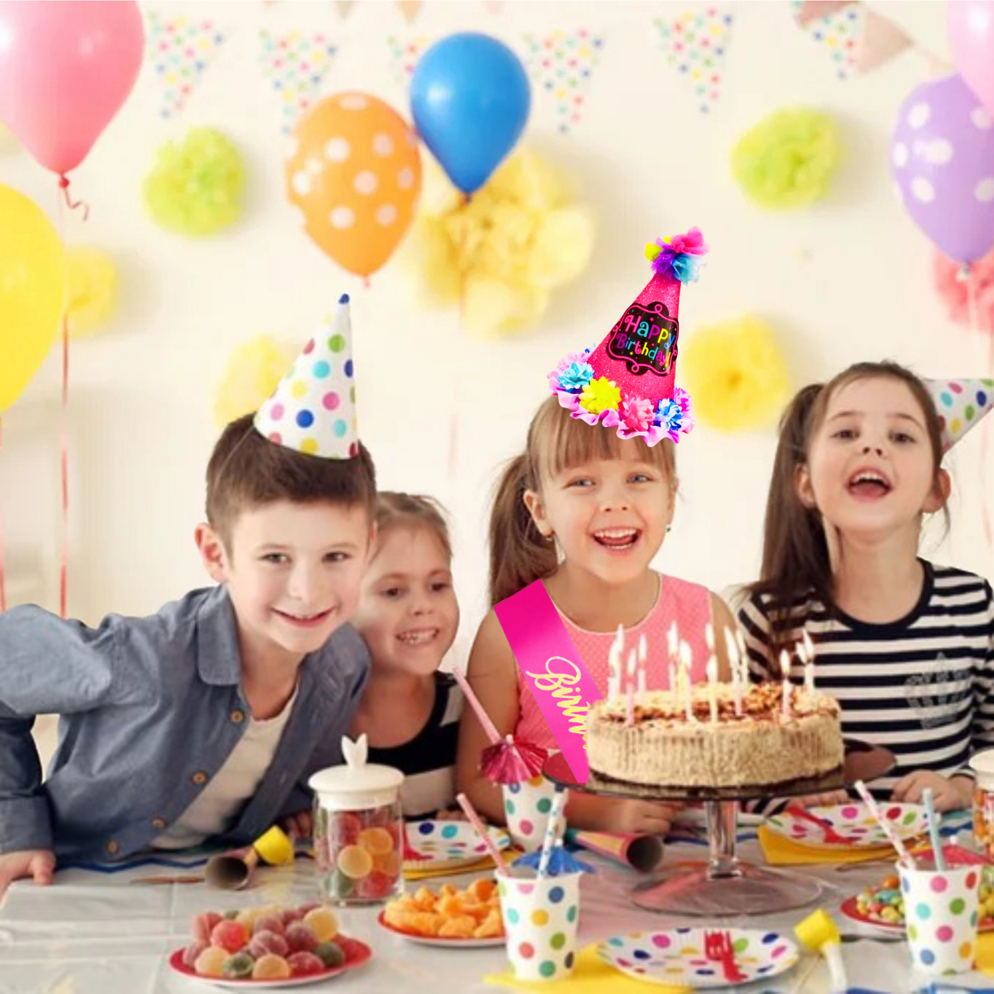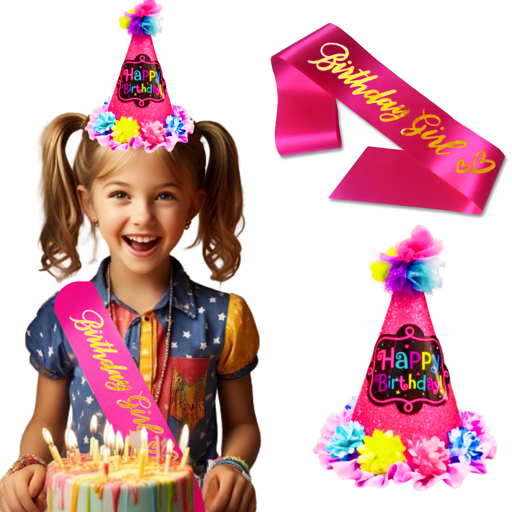 Pink Happy Birthday Floral Conical Hat & Sash Combo for Girls - Set of 2