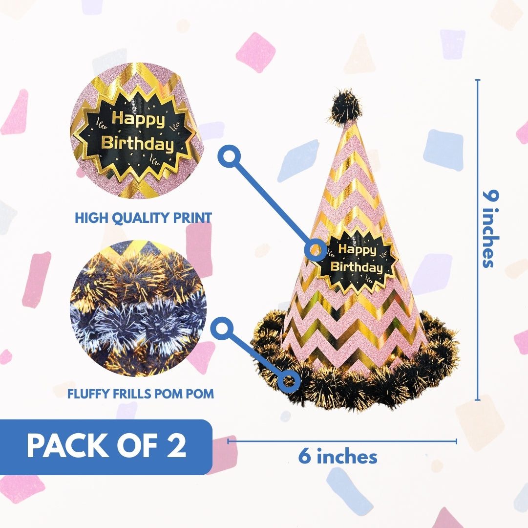 Happy Birthday Multicolor Hats Combo with Chevron Print laced with Pom Pom - 3PC