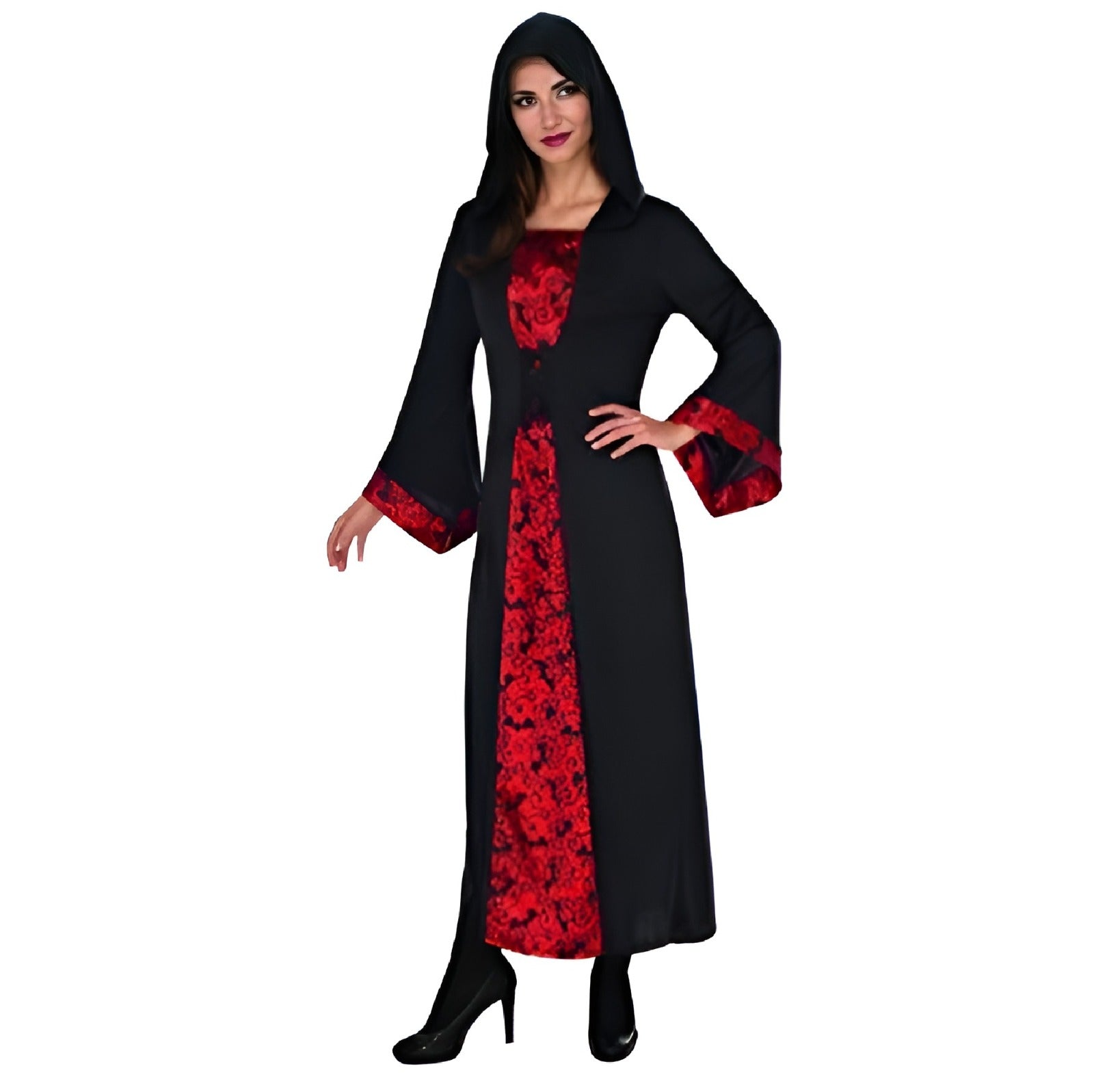 Get the good-girl-gone-bad look in our Adult Gothic Hood Women costume! Featuring bright satin-like fabric, this dress features ribbon accents at the waist, decorative ribbon lacing up the chest, and lace trim along the hem. The matching hooded cape is cropped to show off your Halloween beauty and make every boy go-gaga by your look.