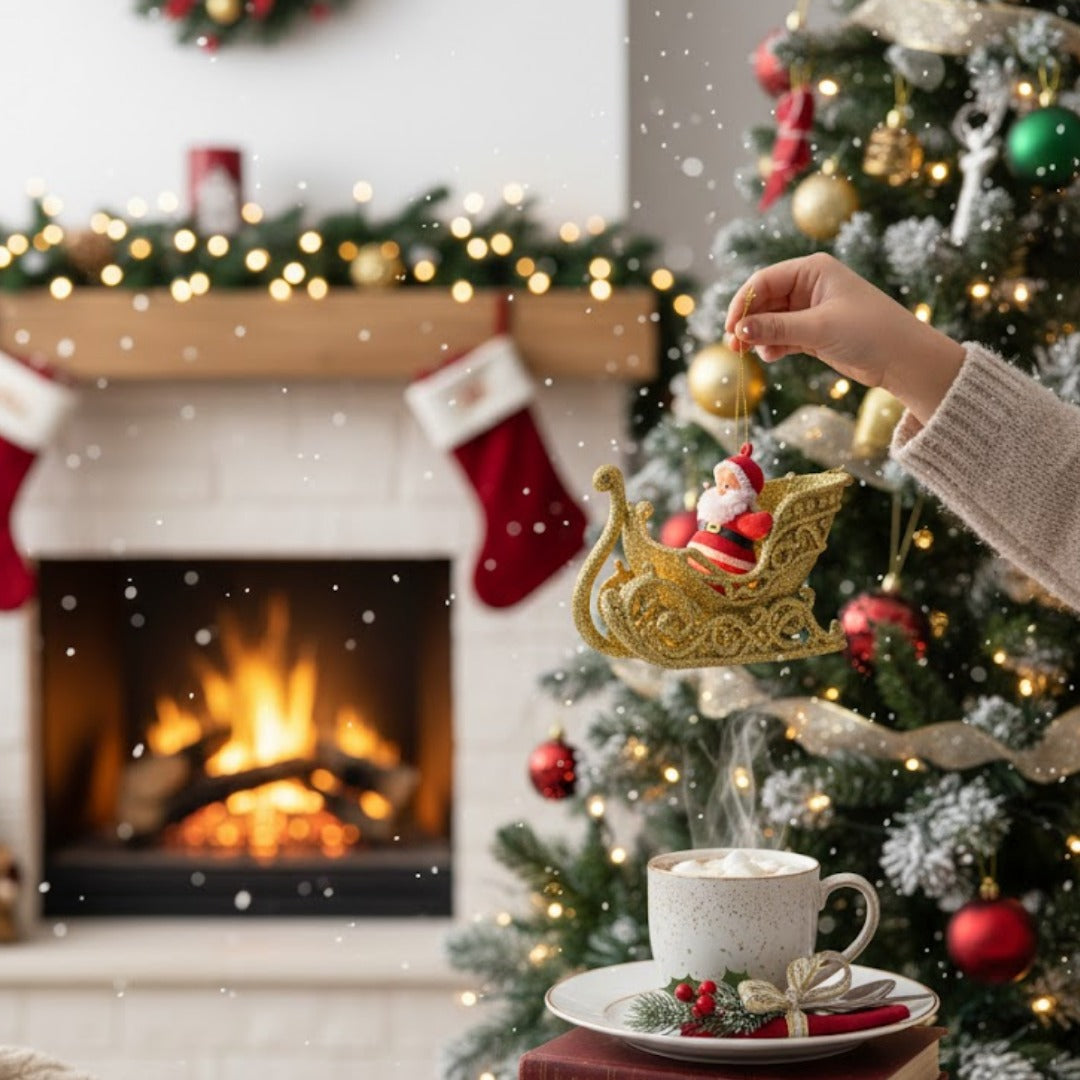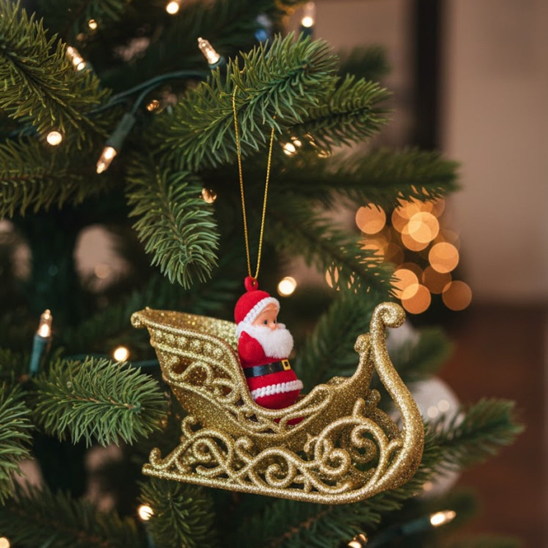 Small Santa on Golden Shimmery Sledge for Christmas Tree Decor - 1PC