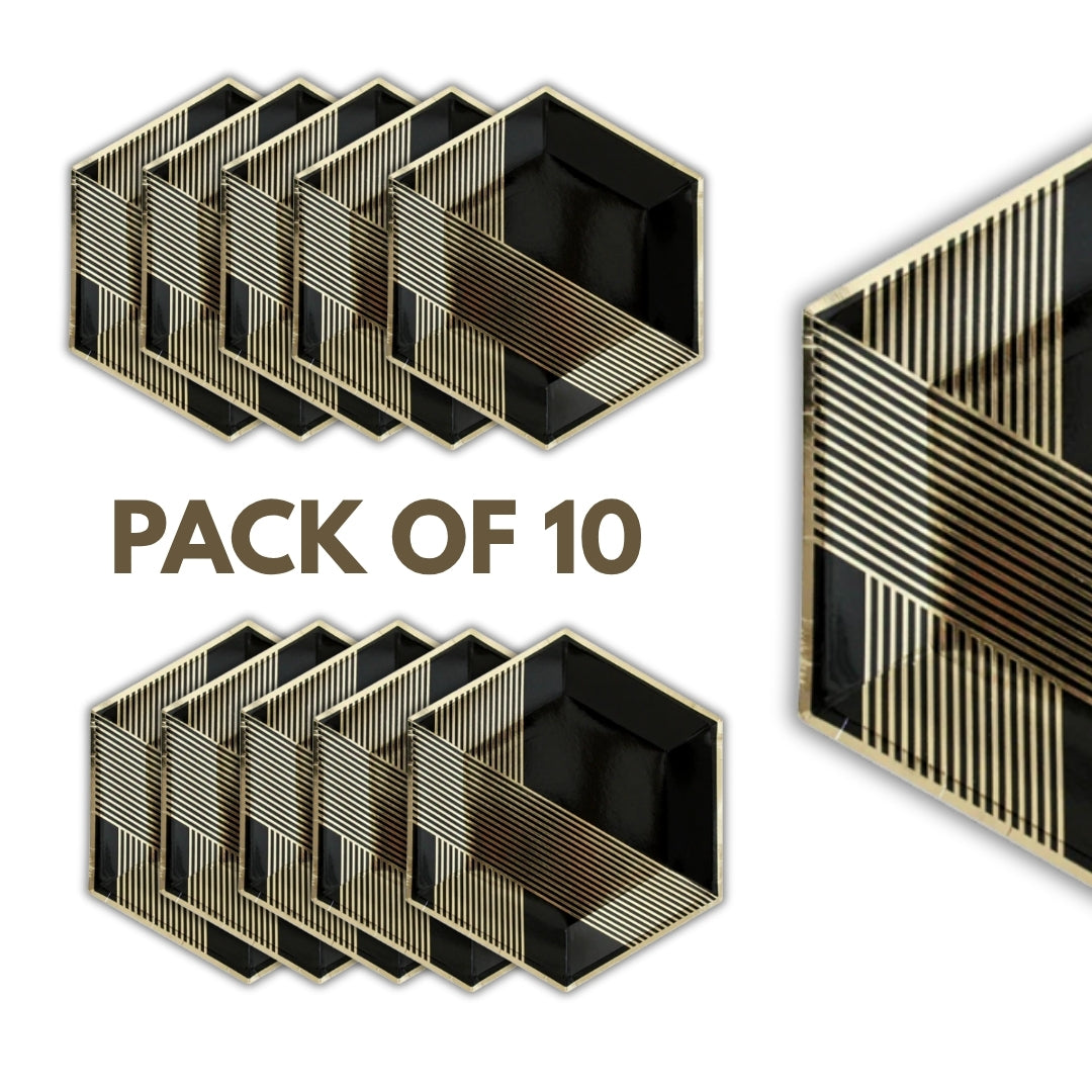 INSIDE THE PACK:This package contains 10 PCS Black & Gold Paper Plates 9" in Hexagonal Shape