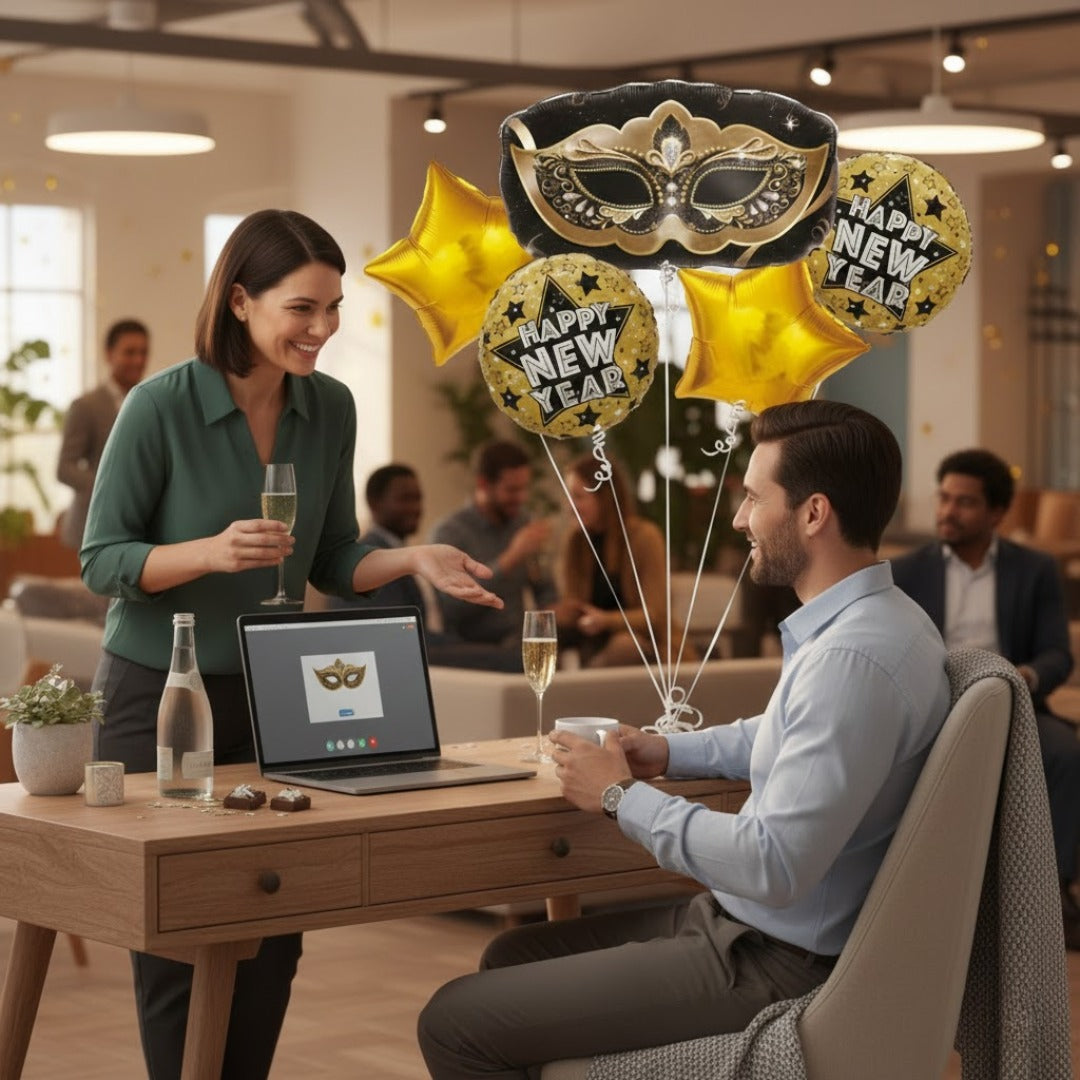 This set includes 5 mask-shaped foil balloons featuring “Happy New Year” designs. The coordinated set helps you create a well-themed decoration setup for walls, backdrops, or party spaces with minimal effort.
