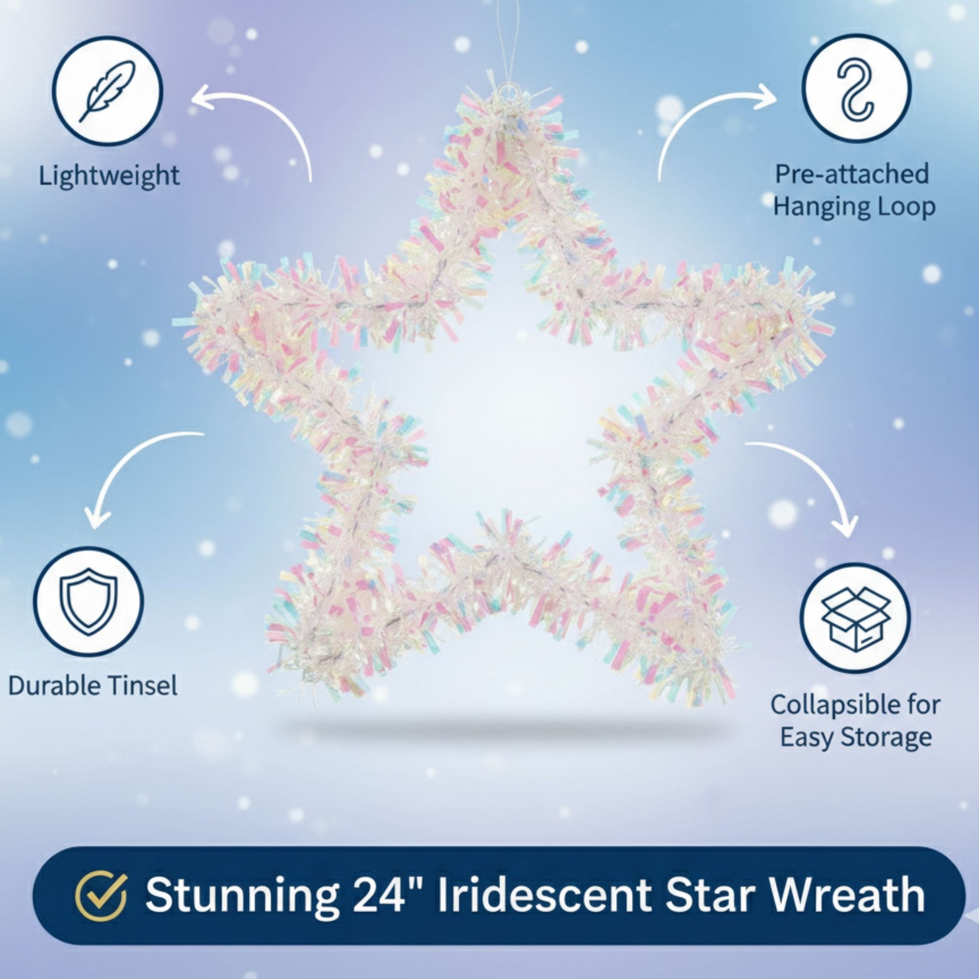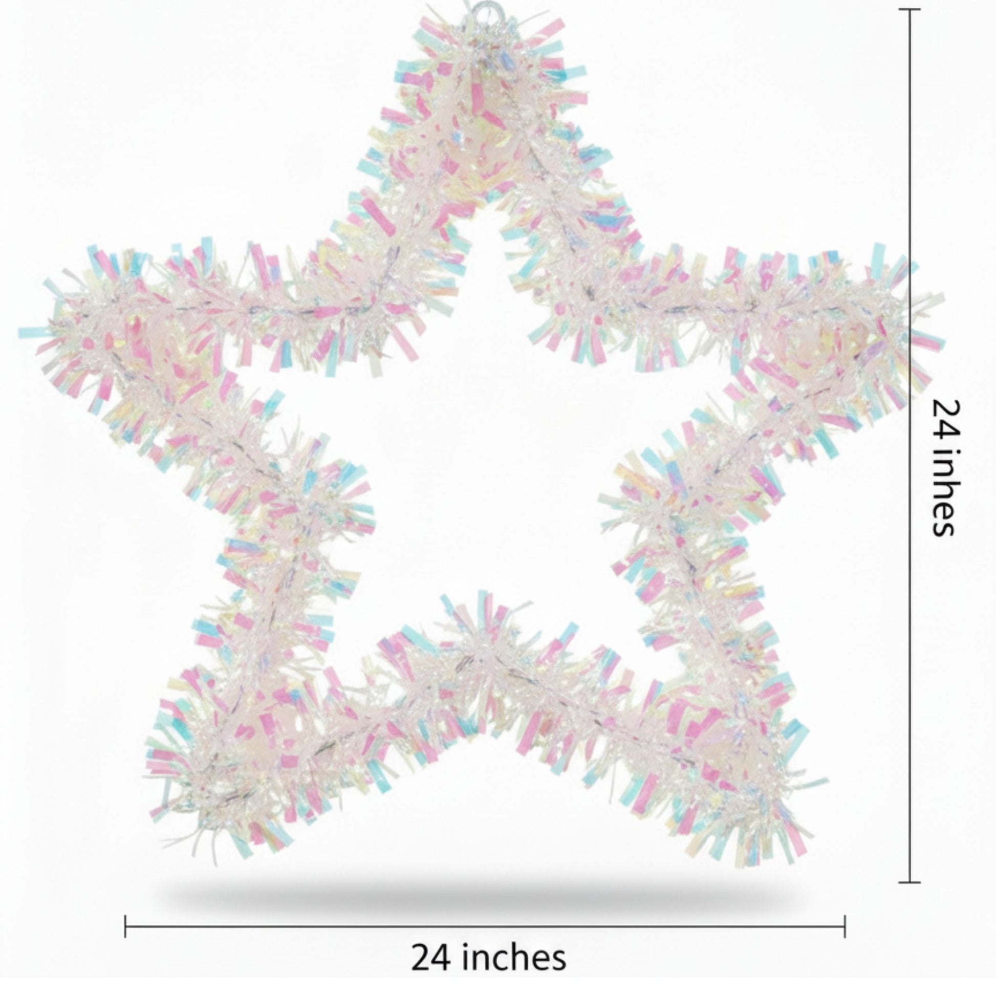 Stunning 24" Iridescent Star Wreath: This large star-shaped wreath measures a full 24 inches, creating a dazzling focal point for your Christmas décor. Its shimmering iridescent finish reflects light beautifully, adding festive sparkle to any space.