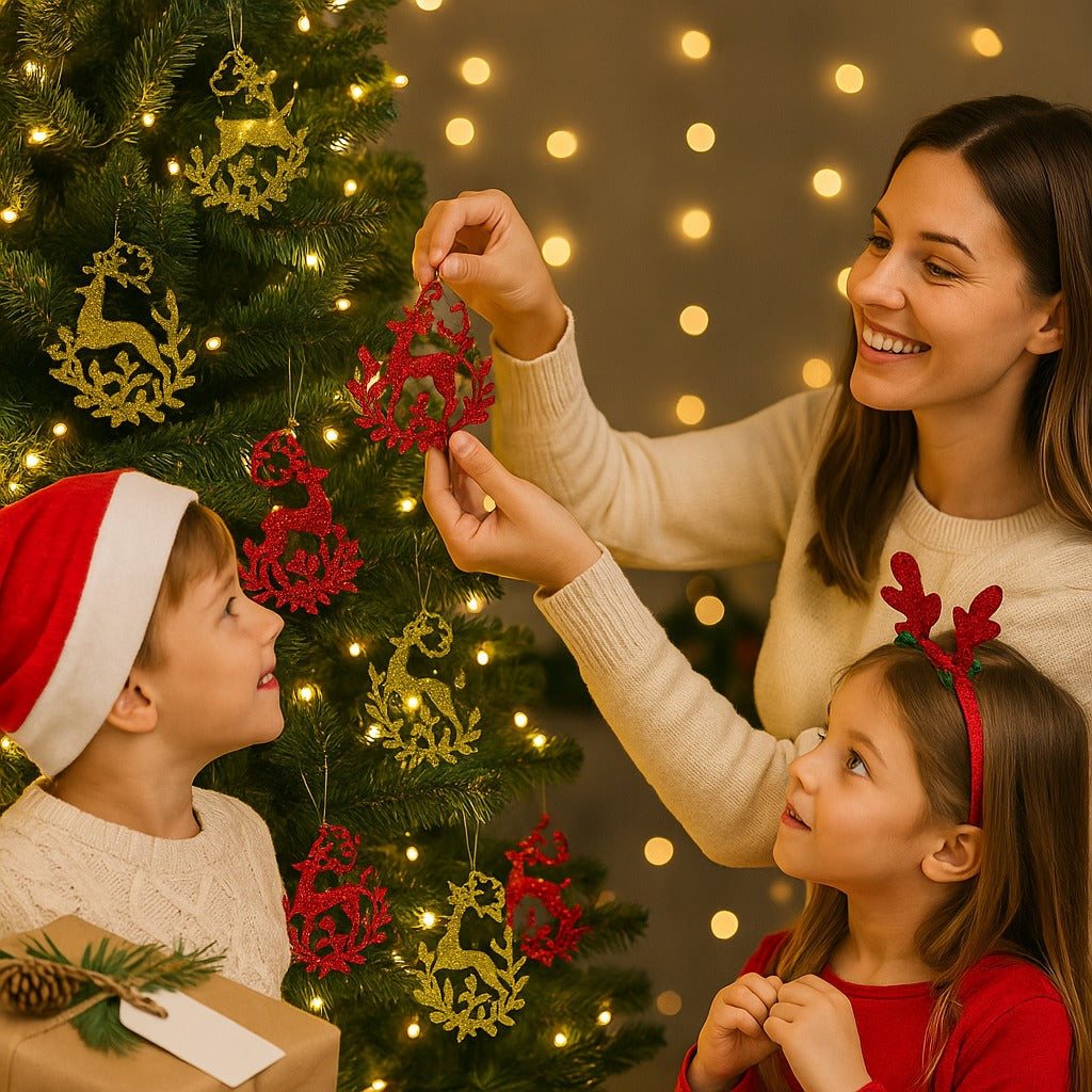 Set of 2 Sparkling Reindeer Hanging Ornaments: This pack includes two beautifully crafted reindeer ornaments designed with elegant shapes and coated in bright glitter. Perfect for adding a festive, magical touch to your Christmas tree and holiday decorations.