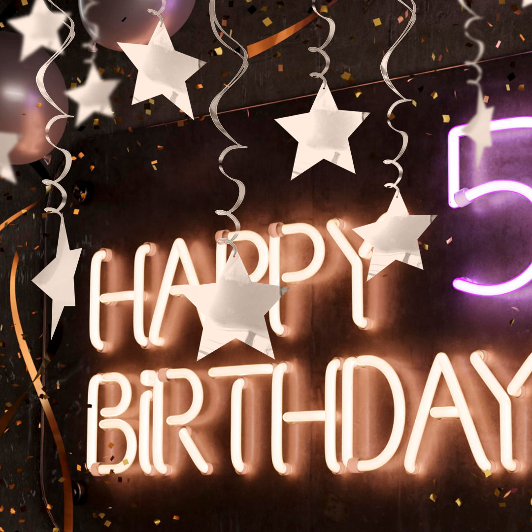 Let sterling starlight shine at your party or special event with our Silver Hanging Swirl Decorations! Package includes 15 swirl decorations. Each feature a die-cut foil star attached to a silver metallic swirl that shimmers as it twirls. A plastic loop is attached at top for easy hanging. Decoration is perfect to hang from a ceiling or doorway to instantly bring a fun mood to your party.